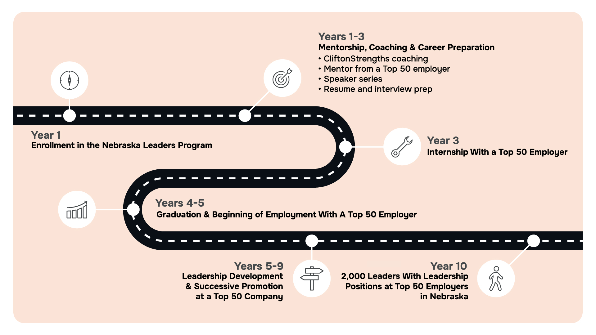 The Nebraska Leaders Program was designed to identify, cultivate, and retain top undergraduate talent within the State of Nebraska. Join a community that pairs Nebraska’s future leaders with coaching, mentorship, internships, and exclusive job opportunities.